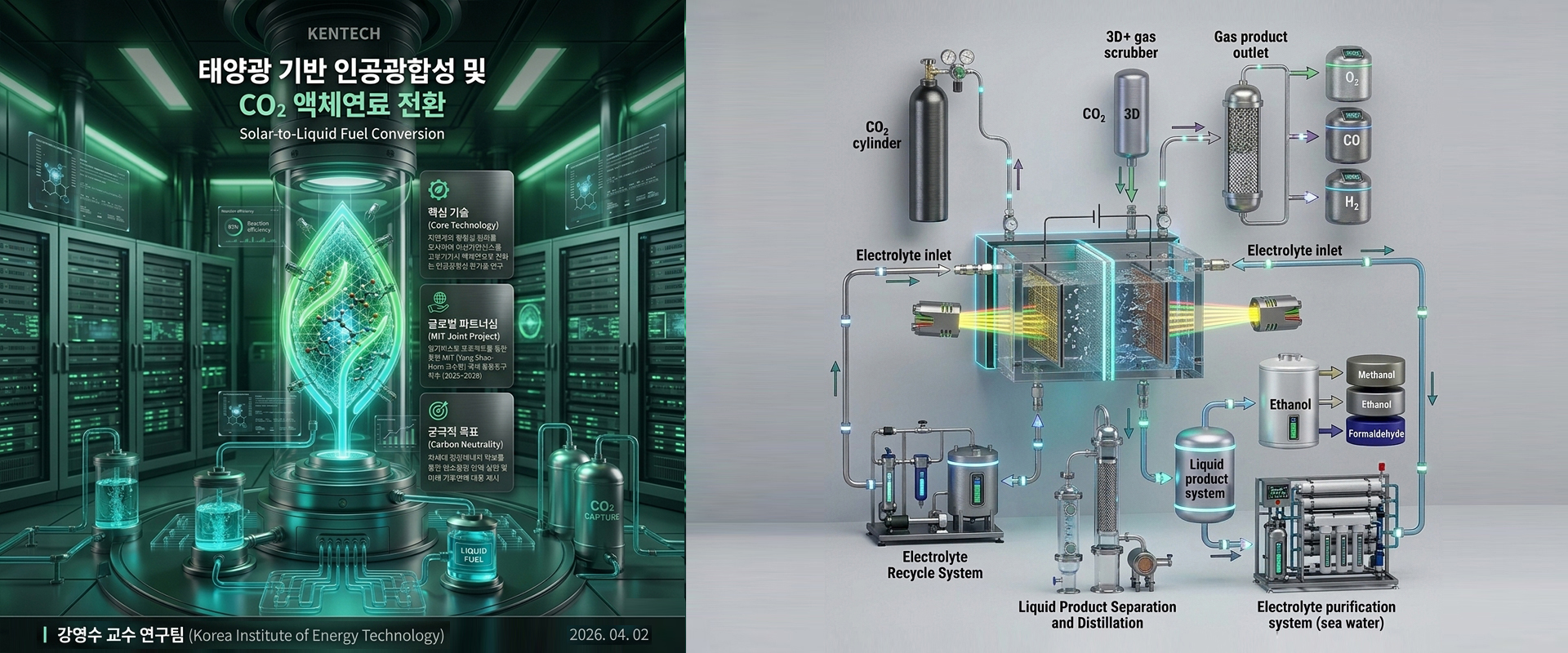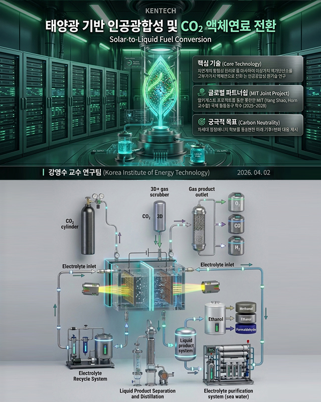 Solar CO2 Conversion into Liquid Fuels Institute for Environmental and Climate Technology Korea Institute of Energy Technology (KENTECH) Introduction News 2026.02.10 [과기원 리포트] 4 KENTECH-MIT 함께 여는 청정에너지 미래_강영수 교수 more 2025.07.06 광주MBC-켄텍, MIT와 인공광합성 기술 개발 more 2025.07.05 뉴시스-"이산화탄소를 액체 연료로"…켄텍-MIT 국제공동연구 more 2025.07.05 머니투데이-한국에너지공과대, 미 MIT와 '인공광합성' 핵심기술 개발 국제공동연구 착수 more 2025.07.05 뉴스1-에너지공대-美MIT, 인공광합성 핵심기술 개발 국제공동연구 more